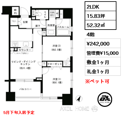 11階2LDKタイプ、52.37㎡のお部屋を内見しました。