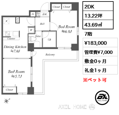 | 条件 | ペット相談可(小型犬または猫1匹まで/敷金1ヶ月増) |
