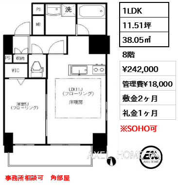| 条件 | 事務所・SOHO相談可(敷金2ヶ月、賃料等に別途消費税) |