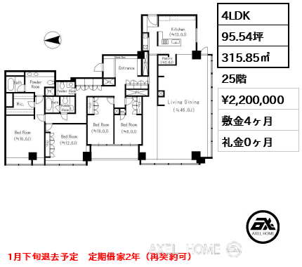 | 敷金 | 4ヶ月 | 礼金 | 0ヶ月 |