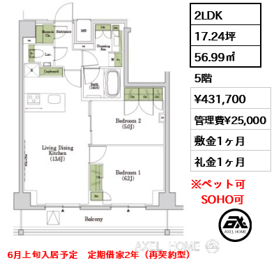 | 備考 | 6月上旬入居予定 定期借家2年(再契約型) | ||