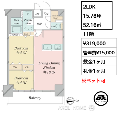 | 敷金 | 1ヶ月 | 礼金 | 0ヶ月 |